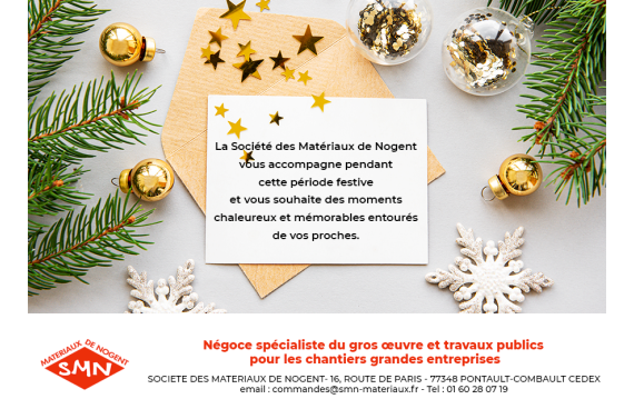 La Société des Matériaux de Nogent vous accompagne pendant cette période festive et vous souhaite des moments chaleureux, joyeux et mémorables entourés de vos proches.