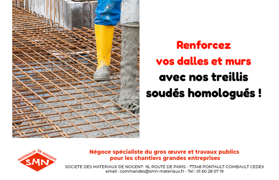A la Société des Matériaux de Nogent, découvrez nos treillis soudés NF pour Béton Armé : panneaux d’acier, fils croisés et soudés, idéaux pour armatures anti-fissuration sur dalles non armées, peaux de murs et planchers tous niveaux.